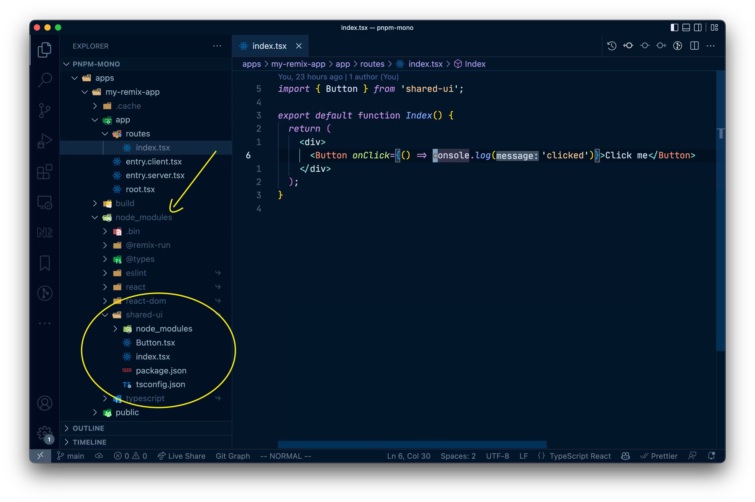 Our shared-ui library is ready so we can use it in the Remix application hosted within the apps folder of our repository. We can either manually add the dependency to Remix's package.json or use PNPM to add it: